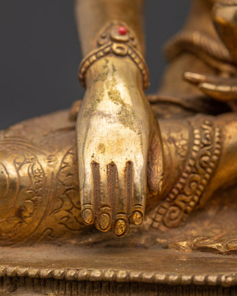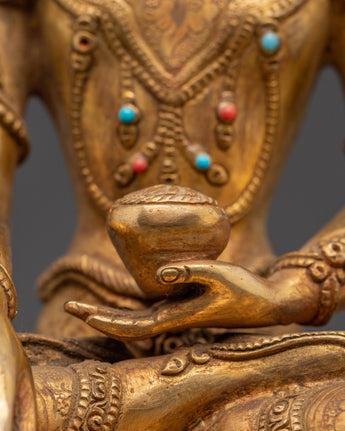 This Shakyamuni Buddha statue shows the historical Buddha, who attained enlightenment under the Bodhi tree and imparted profound teachings all across the world. The copper and gold gilded materials provide shine, while the painstakingly arranged turquoise stones create a sense of tranquility and harmony. With its exquisite craftsmanship, this statue not only signifies spiritual enlightenment, but also acts as a focal point for your altar or meditation area, creating a tranquil and inspiring environment.
