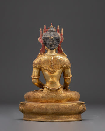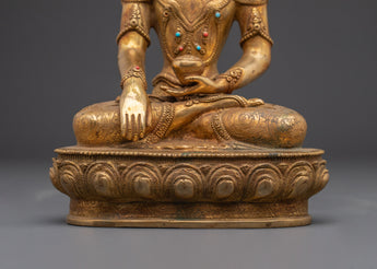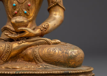 This Shakyamuni Buddha statue depicts the historical Buddha, who reached enlightenment beneath the Bodhi tree and spread deep teachings throughout the world. The copper and gold gilded materials provide luster, while the meticulously placed turquoise stones add a sense of calm and harmony. With its beautiful craftsmanship, this statue not only represents spiritual enlightenment but also serves as a focus point for your altar or meditation room, resulting in a serene and inspiring setting.