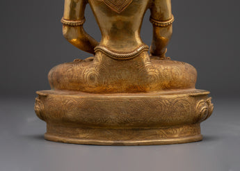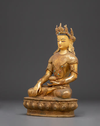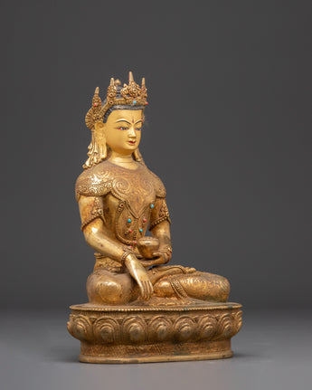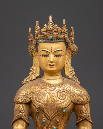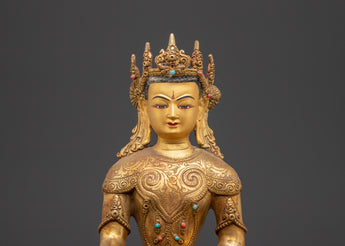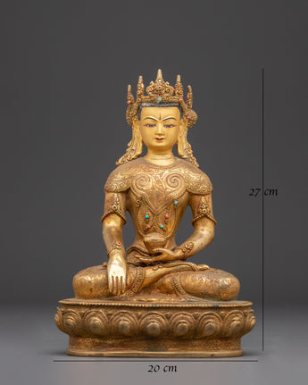 The Handcrafted Crown Shakyamuni Buddha Statue measures 27cm in height and 20cm in width, making it a stunning addition to any spiritual space. This statue is expertly carved from copper, and its magnificent gold plated finish exudes a brilliant, divine atmosphere. The elaborate design includes a beautiful crown above Shakyamuni Buddha, which represents wisdom, enlightenment, and monarchy. Adorned with turquoise artificial stones, this statue strikes the perfect mix between visual beauty and spiritual importance, improving your meditation and prayer routines.