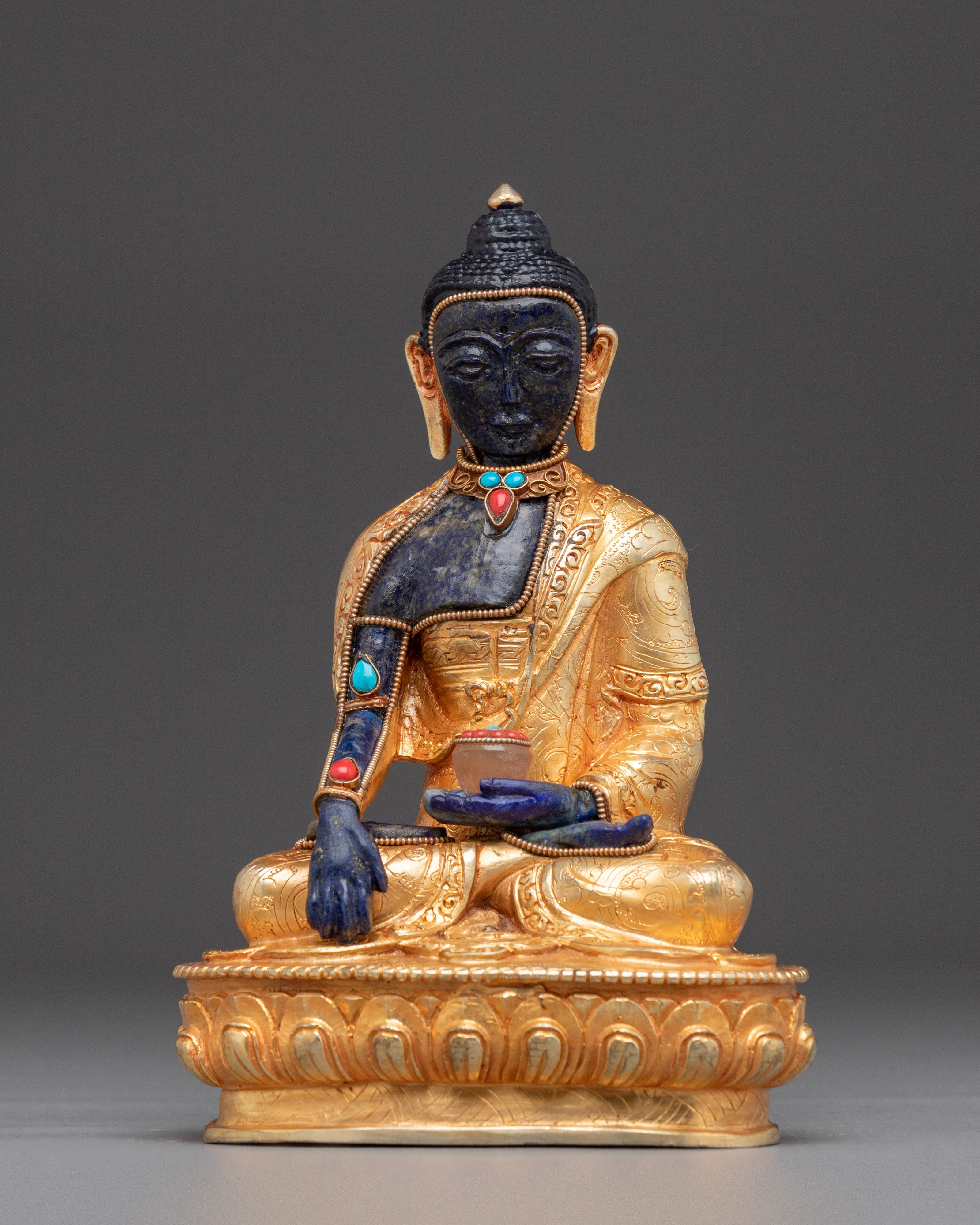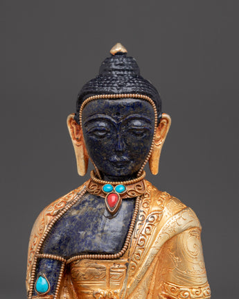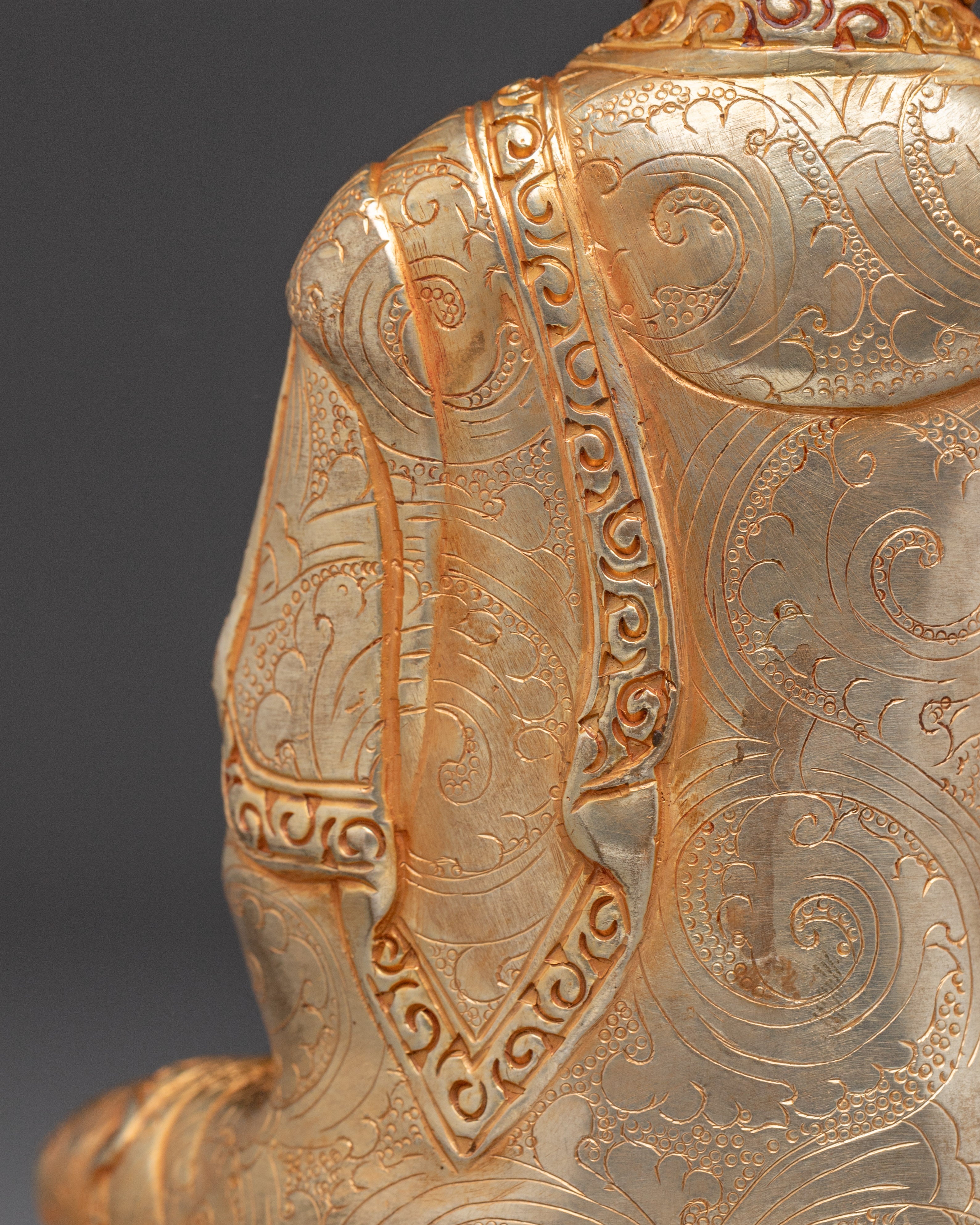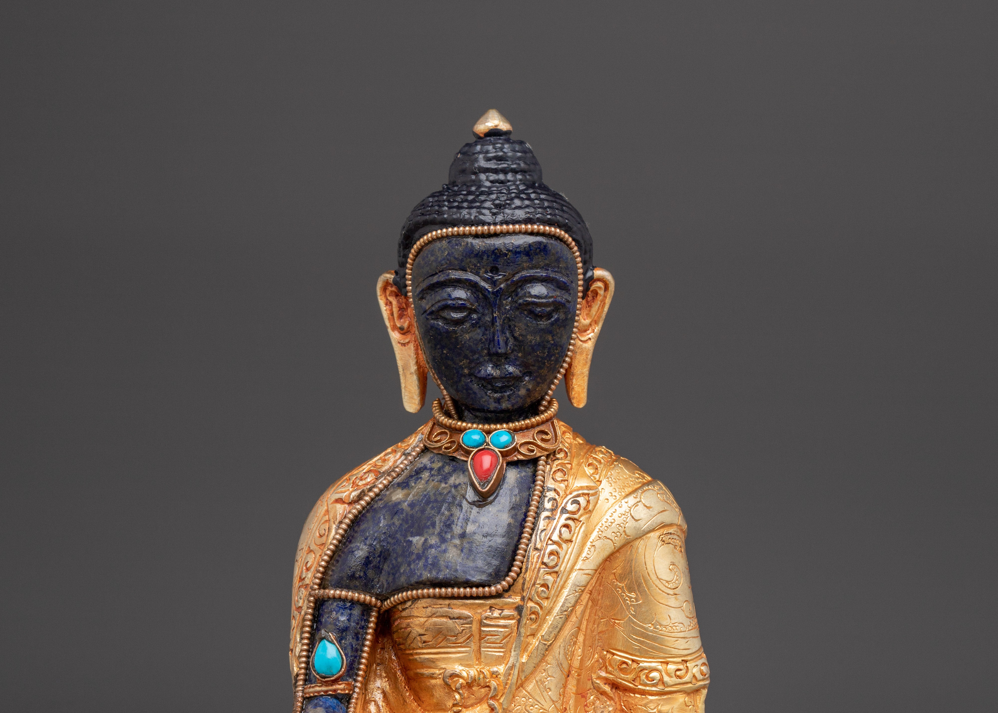 Our Handcrafted Sculpture of Shakyamuni Buddha radiates serenity, wisdom, and timeless craftsmanship. Measuring 20.5cm in height and 14cm in width, with a solid weight of 1.03kg, this exquisite piece embodies harmony and spiritual presence. Expertly crafted from a Copper Body with rich Gold Plating, the statue features a crystal bowl gracefully held in the Buddha’s hand and is adorned with Lapis Lazuli, Coral, and Turquoise stones that enhance its divine elegance. Every intricate detail—from the gentle folds of his robe to the tranquil expression on his face—reflects the depth of Buddhist artistry and the peaceful energy of Shakyamuni, the Enlightened One.