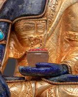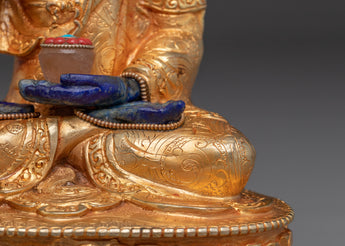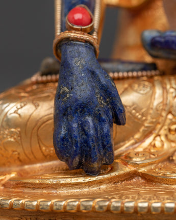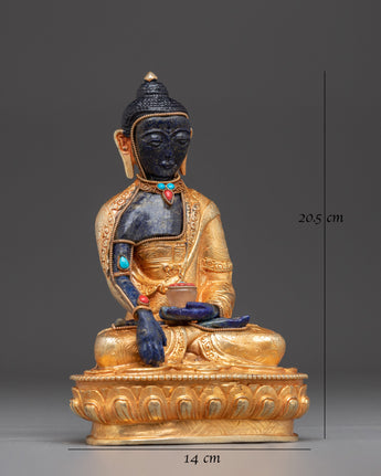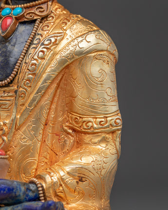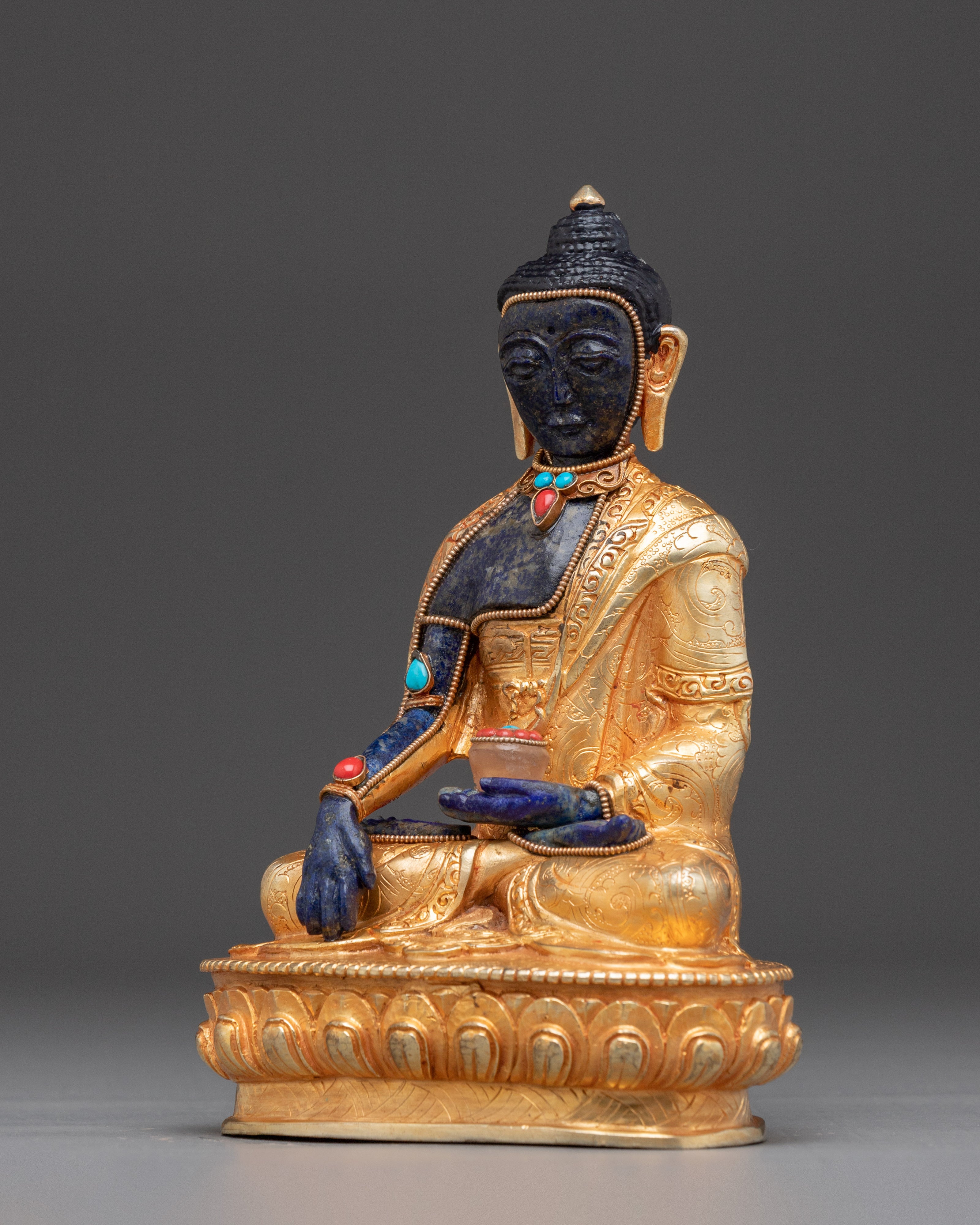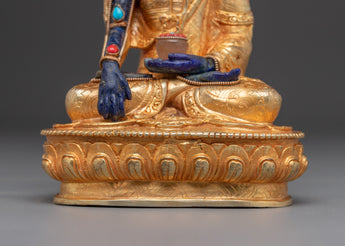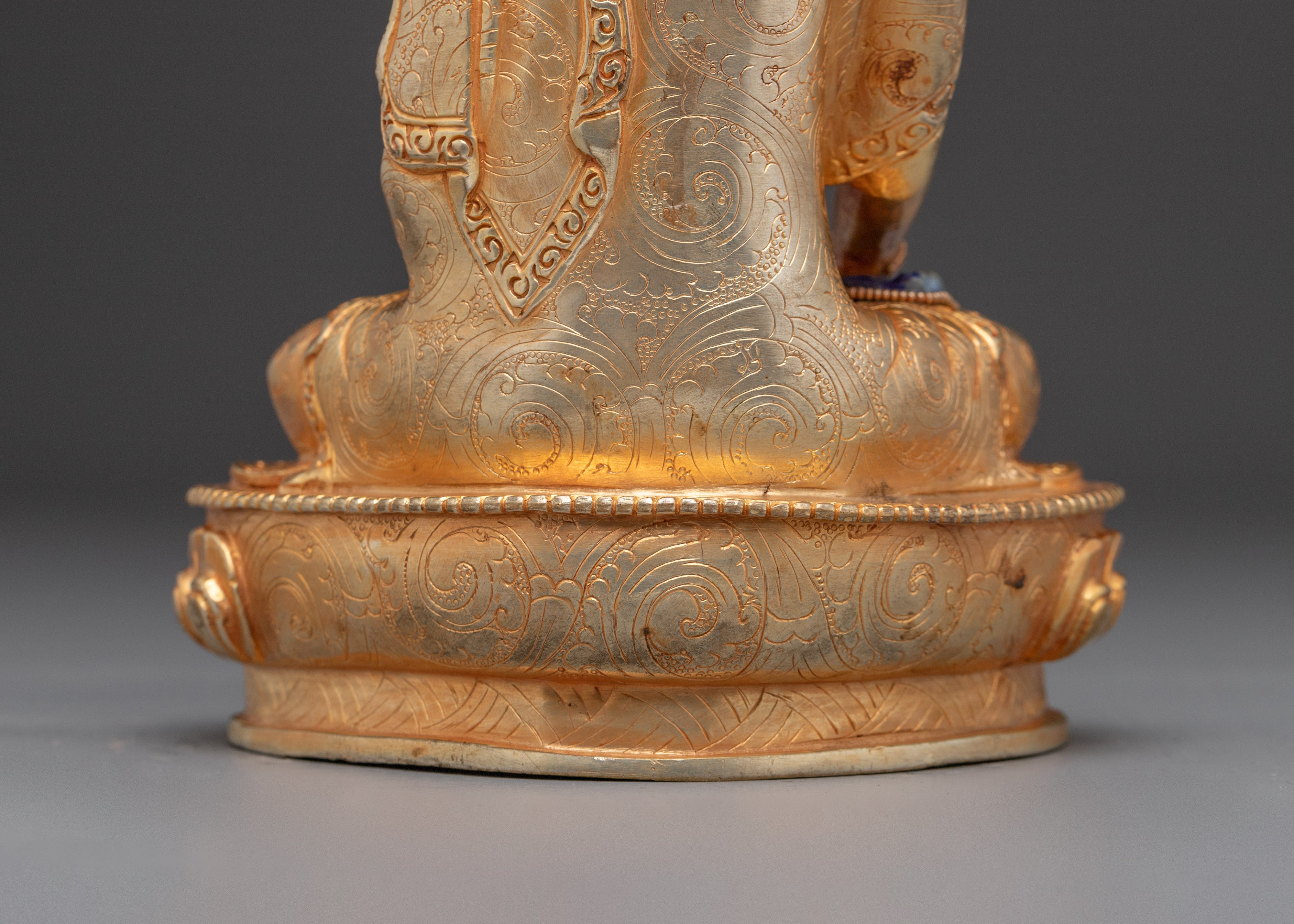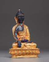 Our Handcrafted Sculpture of Shakyamuni Buddha radiates serenity, wisdom, and timeless craftsmanship. Measuring 20.5cm in height and 14cm in width, with a solid weight of 1.03kg, this exquisite piece embodies harmony and spiritual presence. Expertly crafted from a Copper Body with rich Gold Plating, the statue features a crystal bowl gracefully held in the Buddha’s hand and is adorned with Lapis Lazuli, Coral, and Turquoise stones that enhance its divine elegance. Every intricate detail—from the gentle folds of his robe to the tranquil expression on his face—reflects the depth of Buddhist artistry and the peaceful energy of Shakyamuni, the Enlightened One.