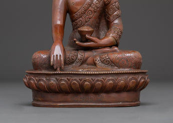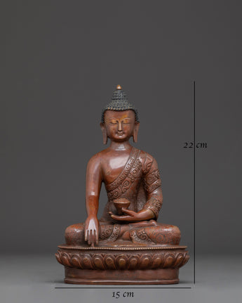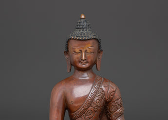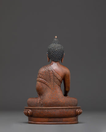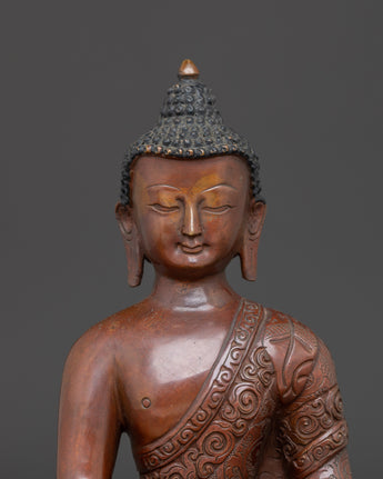 This handcrafted statue of Shakyamuni Buddha embodies the essence of the Enlightened One in a serene, meditative pose. This sacred artwork, measuring 22cm in height and 15cm in breadth and crafted from oxidized copper, exudes serenity and spiritual grace. The Buddha is seen in the iconic earth-touching mudra, which represents his moment of enlightenment under the Bodhi tree. His serene smile and balanced posture convey deep compassion, reminding practitioners of the limitless calm that comes from inner awareness and mindfulness.