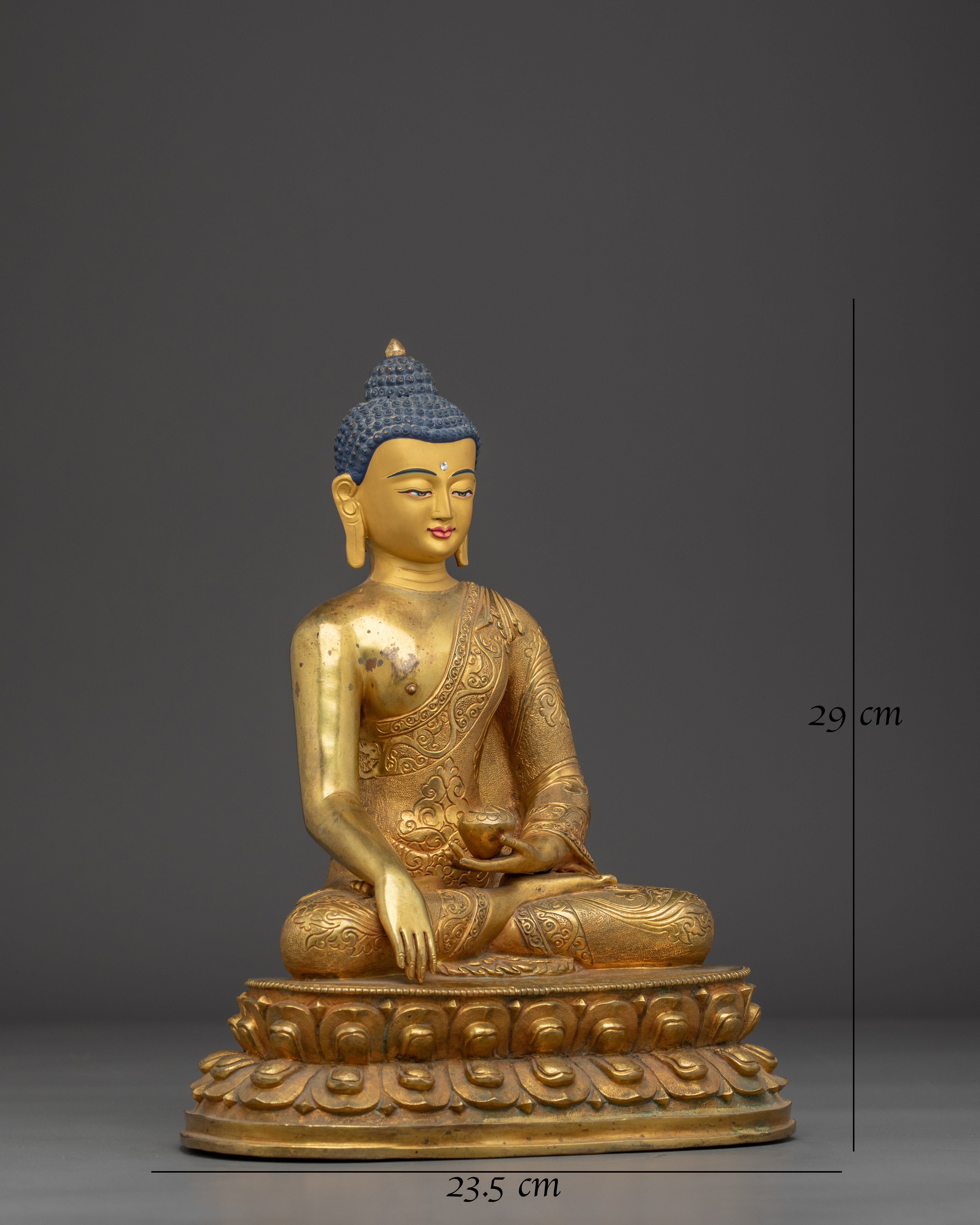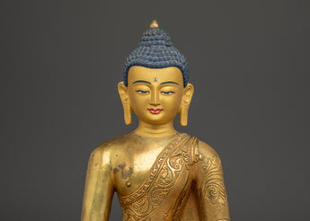 Immerse yourself in serenity with this Handcrafted Tibetan Buddha Statue, meticulously crafted to bring peace and spiritual energy into your space. This stunning sculpture features a copper body, beautifully plated in gold, embodying the timeless artistry of Tibetan craftsmanship. Standing at 29 cm tall and 23.5 cm wide, this Buddha statue serves as a calming focal point for meditation rooms, living spaces, or altars, enhancing the atmosphere with its tranquil presence.
