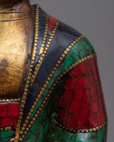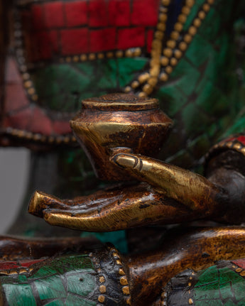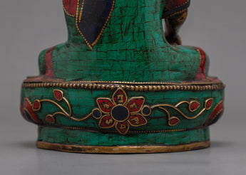 The Shakyamuni Buddha is a highly regarded Buddhist figure known for his teachings on the path to enlightenment. The copper Shakyamuni Buddha statue has intricate details that bring the figure to life. The gemstones embedded within the statue's body add a touch of elegance and symbolism to the overall design. The Buddha is shown seated, his face serene, and his hands in a mudra, or meditation gesture. The statue serves as a reminder of Buddha's teachings as well as an inspiration to those seeking inner peace and spiritual awakening.
