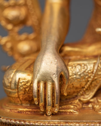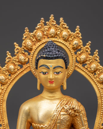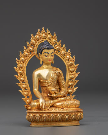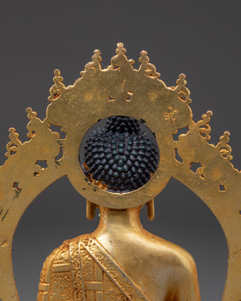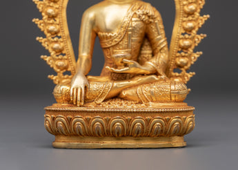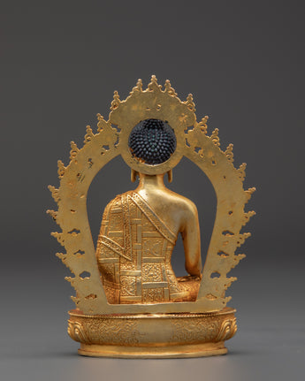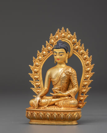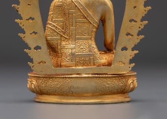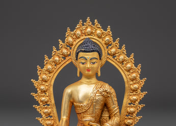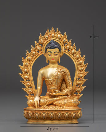 Shakyamuni Sculpture captures the serene essence of enlightenment in a beautifully crafted seated pose. Made from a copper body and enhanced with elegant gold plating, The figure rests on a beautifully crafted lotus pedestal, surrounded by an elegant halo frame adorned with traditional Buddhist motifs that represent radiance and spiritual purity. At 11cm tall, 8.5cm wide, and weighing 0.22kg, this small but spiritually powerful statue is perfect for personal shrines, meditation spaces, or as a meaningful spiritual gift. Its handcrafted detail and symbolic posture bring mindfulness, presence, and reverence to any space it occupies.