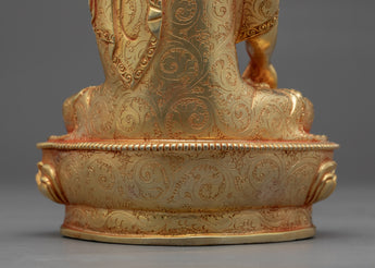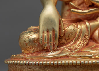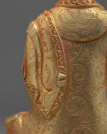 The Shakyamuni Buddha statue is a magnificent work of art that exudes artistry and devotion. The statue, which is entirely made of copper, is a labor of love and dedication to the Buddha's teachings. The statue's face is gilded in gold, which adds brightness to the facial features and evokes amazement and reverence. We used a hammer and small chisels to hand-carve the intricate design patterns. The rest of the body is gold-plated, creating a warm, inviting glow that represents the Buddha's spiritual enlightenment.