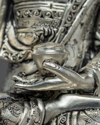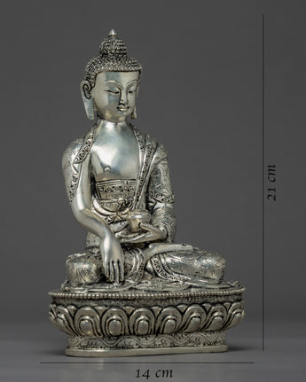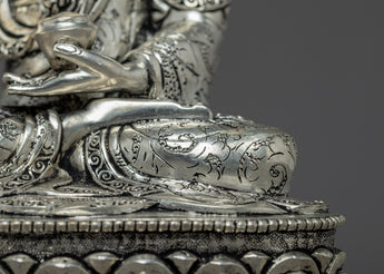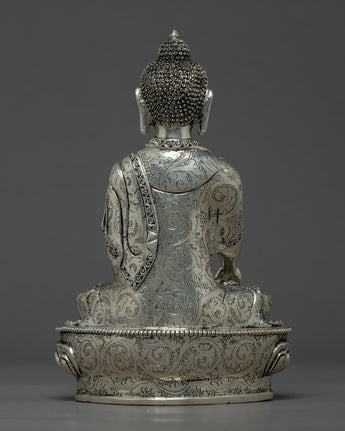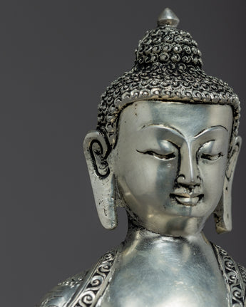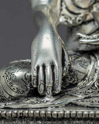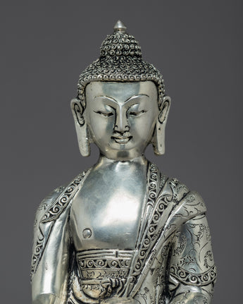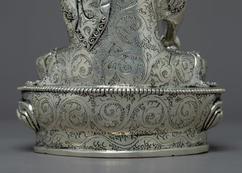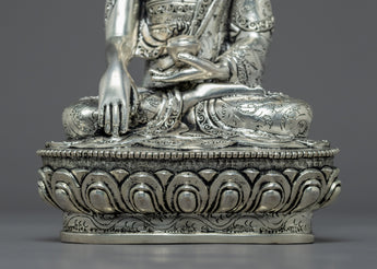 The Shakyamuni statue is a stunning work of art, crafted with a copper body and adorned with silver plating. The deity is depicted sitting on a beautiful lotus base, exuding a sense of serenity and peace. This statue represents the Buddha, also known as Shakyamuni, who is revered as the founder of Buddhism. The details of the statue are intricately designed, capturing the essence of the deity's teachings and wisdom.