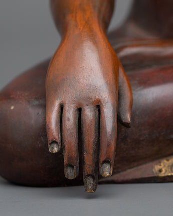 In this statue art, the right hand of Shakyamuni Buddha extends down to touch the ground. This gesture marks the time he summoned the earth to witness his transcendence of the realms of Mara, the supreme God of the world (samsara), who had attempted to draw his attention away from his meditation. As a result of Shakyamuni's achievement of Buddhahood, the earth rocked and shook. Shakyamuni's left-hand rests on his lap and he holds his alms bowl meditatively.