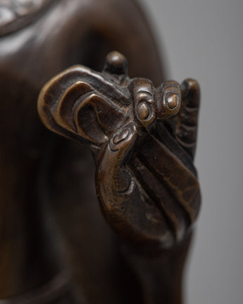 In this statue art, the right hand of Shakyamuni Buddha extends down to touch the ground. This gesture marks the time he summoned the earth to witness his transcendence of the realms of Mara, the supreme God of the world (samsara), who had attempted to draw his attention away from his meditation. As a result of Shakyamuni's achievement of Buddhahood, the earth rocked and shook. Shakyamuni's left-hand rests on his lap and holds his alms bowl in a meditative posture.