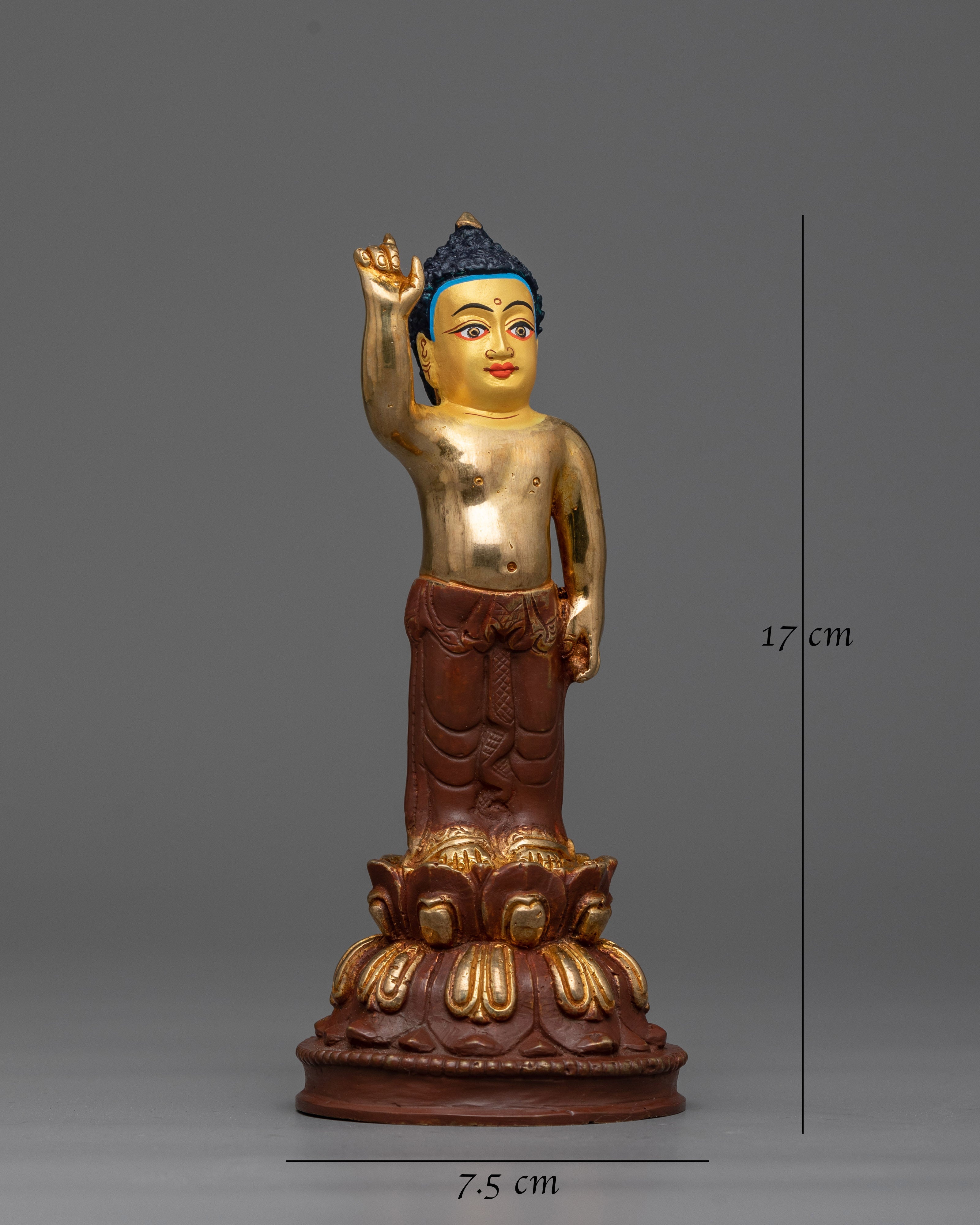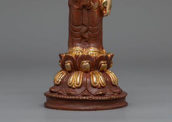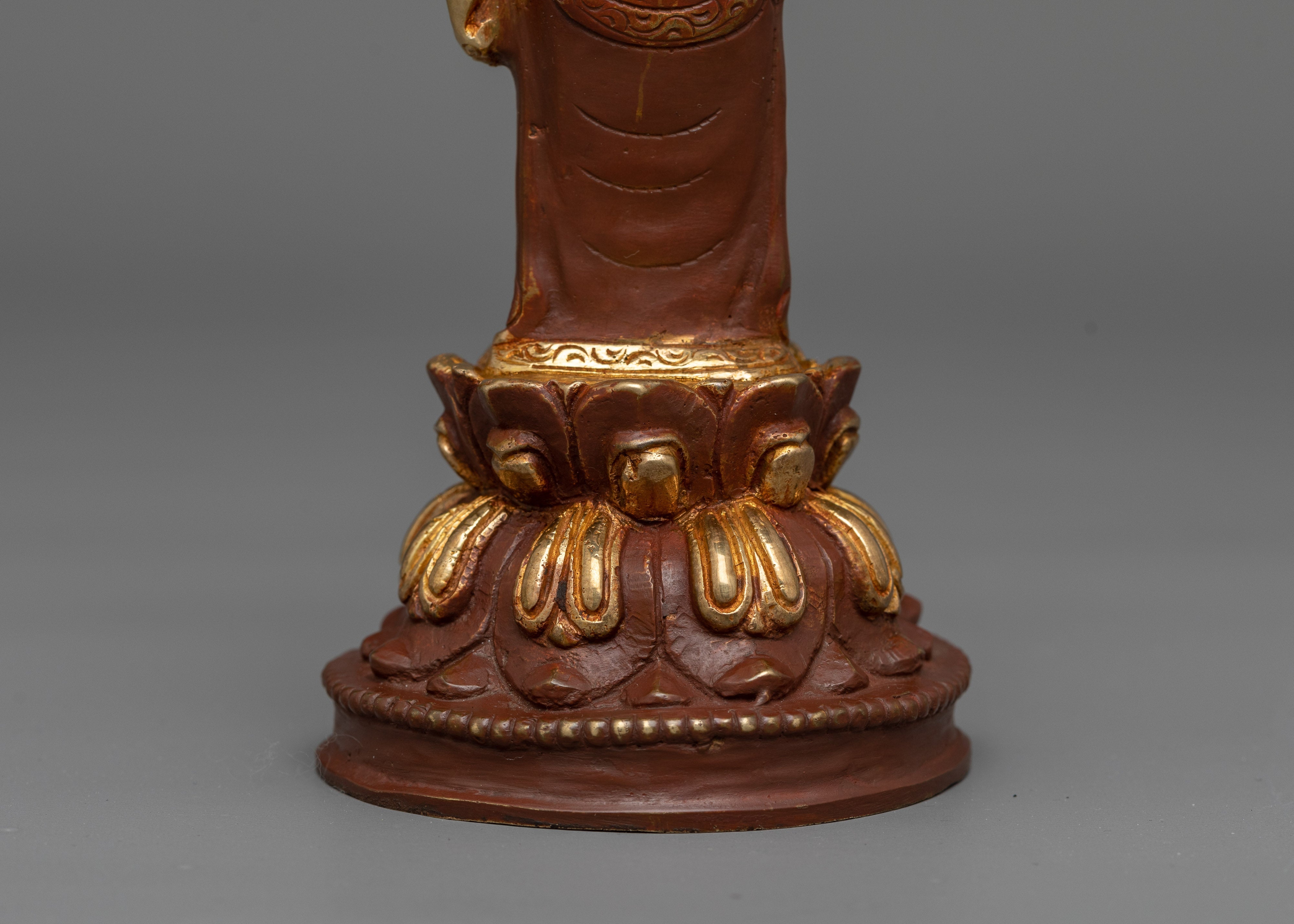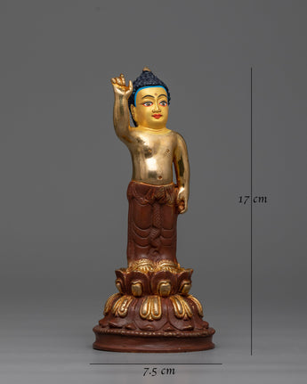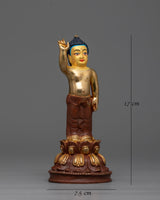 This Standing Shakyamuni Buddha Statue invites you to set off on an amazing enlightenment path. With its remarkable 6.7-inch height and 3.0-inch base, this monument is a remarkable example of both artistic skill and spiritual dedication. With its intricate 24K gold gilding and gold acrylic paintings, this statue, which is made of oxidized copper, is a living embodiment of Shakyamuni Buddha's ageless knowledge and compassion. As you go toward the ultimate truth and relief from suffering, allow the statue's luminous light to fill your environment with heavenly blessings and spiritual knowledge.
