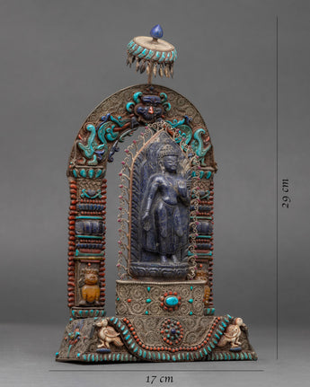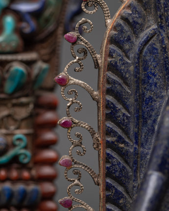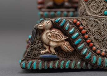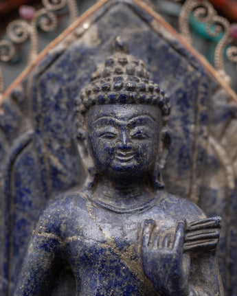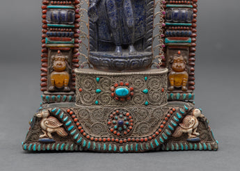 Our Statue is a hand-carved statue of Buddha that includes a beautiful stand that is filigree design. The product is decorated with various types of precious gemstones. The detailing of the statue is beautifully done to give it a perfect look.