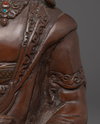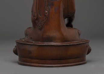 The Statue of Crown Shakyamuni Buddha, handcrafted with care to detail, displays the Buddha's flowing robes, symbolic hand motions, and exquisite patterns on the crown, underlining his hallowed presence. The rusted copper body adds to the statue's visual depth and spiritual atmosphere, emphasizing its craftsmanship and traditional Tibetan artistic traditions. Displaying this image in your environment promotes awareness, devotion, and a closer connection to Shakyamuni Buddha's teachings.