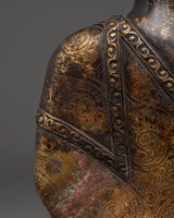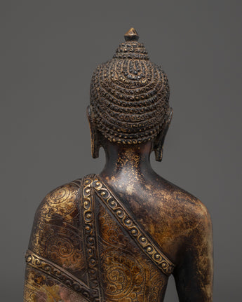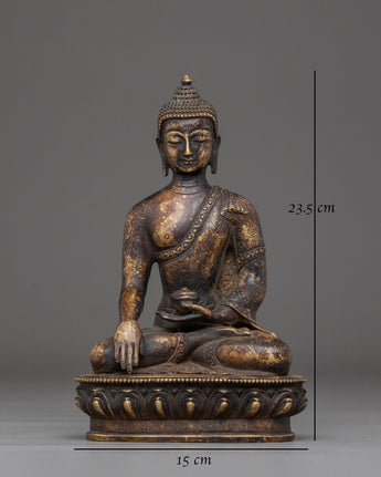 The Shakyamuni Buddha of Light Statue is a revered symbol of peace, wisdom, and illumination of inner truth. This gorgeous sculpture, which measures 23.5cm in height and 15cm in width and weighs 1.32kg, is skillfully handcrafted from oxidized copper and has an appealing antique finish that adds to its everlasting charm. Shakyamuni Buddha, represented in the earth-touching mudra, represents his moment of enlightenment, when he summoned the Earth to witness his victory over ignorance. His peaceful demeanor, delicately carved robe patterns, and balanced posture represent peace and spiritual awakening.