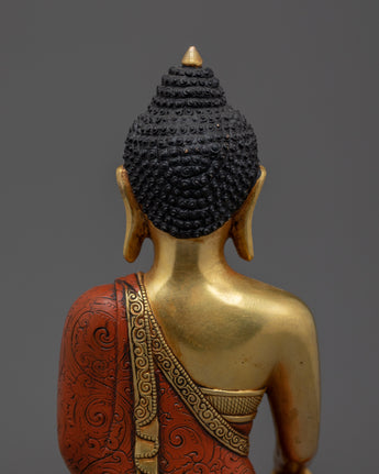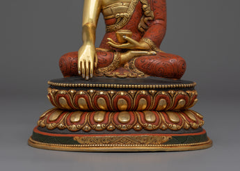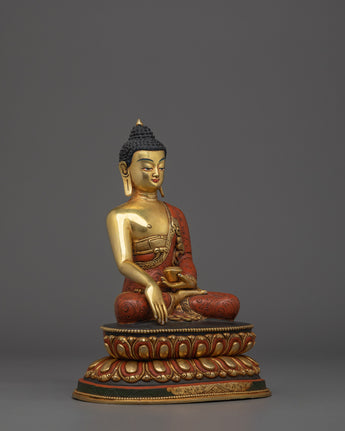 This finely crafted Shakyamuni Buddha statue stands 23 cm tall and measures 18 cm in width, making it perfectly sized for personal altars and sacred spaces. Weighing 2.17 kg, its copper body offers intricate detail, honoring traditional Himalayan artistry. Gilded with gold, the statue radiates a holy glow that enhances its serene presence. The skillful use of acrylic colors accentuates a peaceful expression, inviting calm and spiritual grounding. This exquisite piece embodies the wisdom and compassion of the Enlightened One, making it a meaningful addition to any meditation or devotional practice.