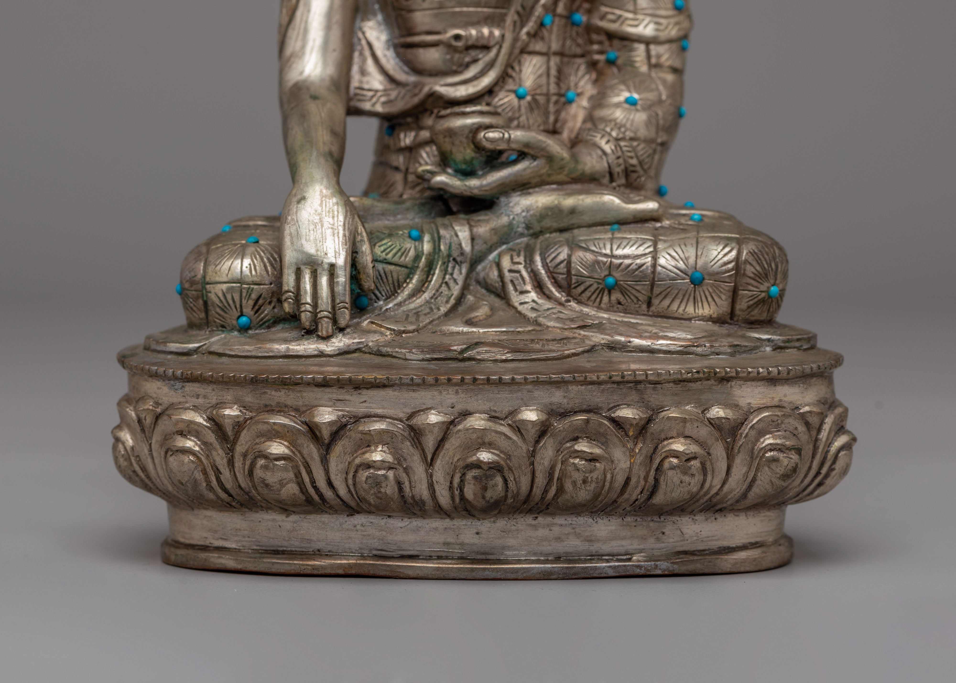 The statue portrays Shakyamuni Buddha seated peacefully on a lotus base symbolizing purity and spiritual awakening beyond worldly attachments. His right hand touches the earth in the Bhumisparsha mudra, representing the moment of enlightenment and the calling of the earth to witness his awakening. The left hand rests in a meditative gesture, symbolizing concentration and inner balance. His serene facial expression reflects compassion, wisdom, and deep contemplation, while the ornate crown and subtle decorative details highlight spiritual grace. Flowing robes and symmetrical design elements reflect classical Tibetan iconography rooted in centuries of sacred artistry. As a revered symbol of enlightenment and mindful living, this Shakyamuni Buddha statue invites peaceful energy, spiritual focus, and devotional presence into meditation spaces and personal shrine settings.