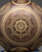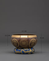 The Bronze Singing Bowl is crafted from bronze, an alloy of copper and tin known for its resonance and durability. The process begins with blending these metals to create the desired tone. The metal is heated and hammered into a bowl shape, with the thickness controlled to produce the correct sound frequencies, and the edge smoothed for easy rubbing with the mallet. Bronze's ability to create long-lasting vibrations makes it ideal for sound therapy and meditation. The wooden mallet strikes or rubs the rim to produce soothing, harmonic sounds central to its therapeutic qualities. The bowl sits on a decorative fabric cushion for stability and aesthetic appeal.