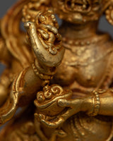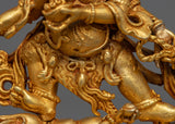 The 6-armed Mahakala Statue is a remarkable fusion of modern craftsmanship and spiritual symbolism. Created with precision, this machine-made statue features a copper body adorned with resplendent 24k gold plating.