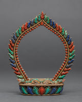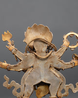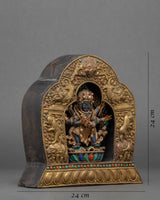 A magnificent six-armed, gold-plated ornament of Mahakala, a copper statue of the formidable Dharma Protector Mahakala, has been meticulously constructed using traditional scripture sources. The statue is kept on the lotus base with the throne of Mahakala. The statue is kept under the Ghau. The Ghau has a different animal design with beautiful Turquoise.