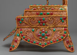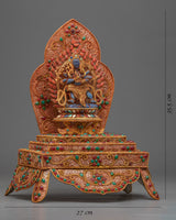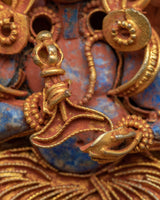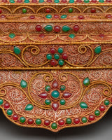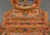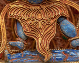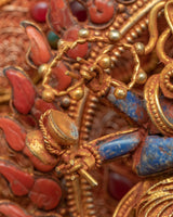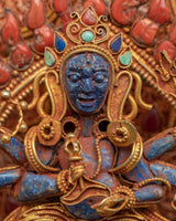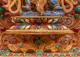The 6-armed Mahakala Statue is a magnificent work of art made of copper and plated in gold. The statue's body is made of exquisite gemstones, adding to its regal appearance. The deity is shown standing on a lotus base with a grand throne beside him. The statue represents strength and power, with its six arms representing different aspects of Mahakala's strength and protection.