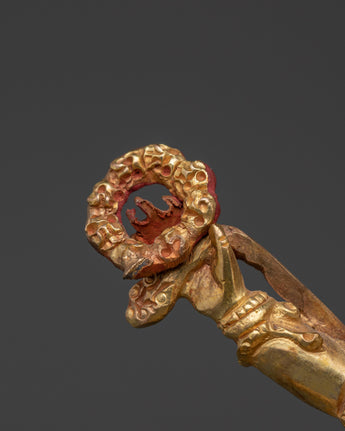 This Six-Armed Mahakala statue is 20 cm tall and 15 cm wide, with a weight of 1.53 kg. The statue is crafted from copper and features a bright gold plating. It rests on a finely designed lotus base. Its size and weight make it an impressive centerpiece for meditation rooms or home altars, exuding a powerful spiritual presence. The gold finish gives a beautiful shine to the figure, highlighting its meticulous craftsmanship and colorful features.