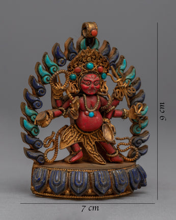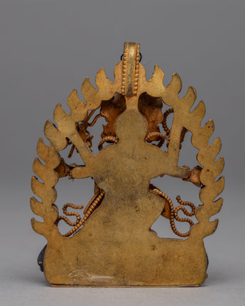 Mahakala is a fierce and powerful deity in Hinduism and Buddhism, depicted with six arms and a body made up of stones. The hands of Mahakala hold various weapons and symbolic objects, while the ornaments on his body are gold-plated, giving him a majestic and awe-inspiring appearance. Standing on a lotus base with a throne beside him, Mahakala is often associated with protection, strength, and overcoming obstacles. The six arms of Mahakala symbolize his ability to accomplish multiple tasks and his readiness to act in various ways to protect his devotees.