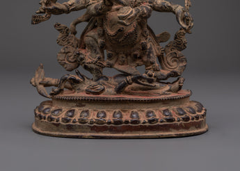 The Divine Dharma Protector Six-Armed Mahakala Statue embodies the powerful energy of protection, guidance, and unwavering strength needed to overcome challenges on the path to enlightenment. Crafted from oxidized copper, this statue captures the fierce yet compassionate spirit of Mahakalaa guardian deity revered in Tibetan Buddhism for safeguarding the Dharma and supporting spiritual growth. Perfect for meditation spaces, Buddhist shrines, or as a thoughtful spiritual gift, this statue encourages qualities of alertness, fearlessness, and deep devotion. Its commanding presence serves as a constant reminder to face obstacles with courage while nurturing inner transformation. Bringing this statue into your environment invites a protective force that helps deepen your practice and fosters resilience in everyday life.