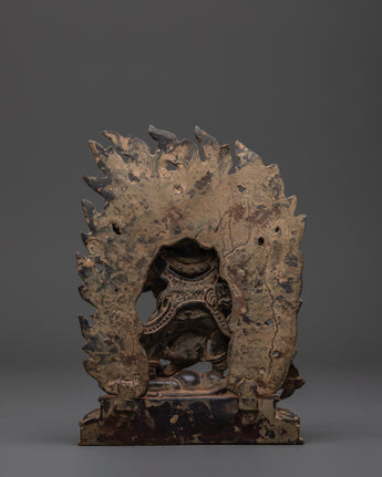 The Dharma Protector Six-Armed Mahakala Statue is an amazing depiction of one of Tibetan Buddhism's most respected protector deities. This monument, measuring 21cm tall and 15cm wide and weighing 1.77kg, represents intense compassion and unwavering protection. Mahakala is depicted with six mighty arms, each holding symbolic implements for cutting through ignorance, removing barriers, and protecting the path of Dharma. The fire aureole that surrounds his shape represents the destruction of hostile energies, while his intense expression and dynamic posture highlight his function as a strong guardian of spiritual practitioners.