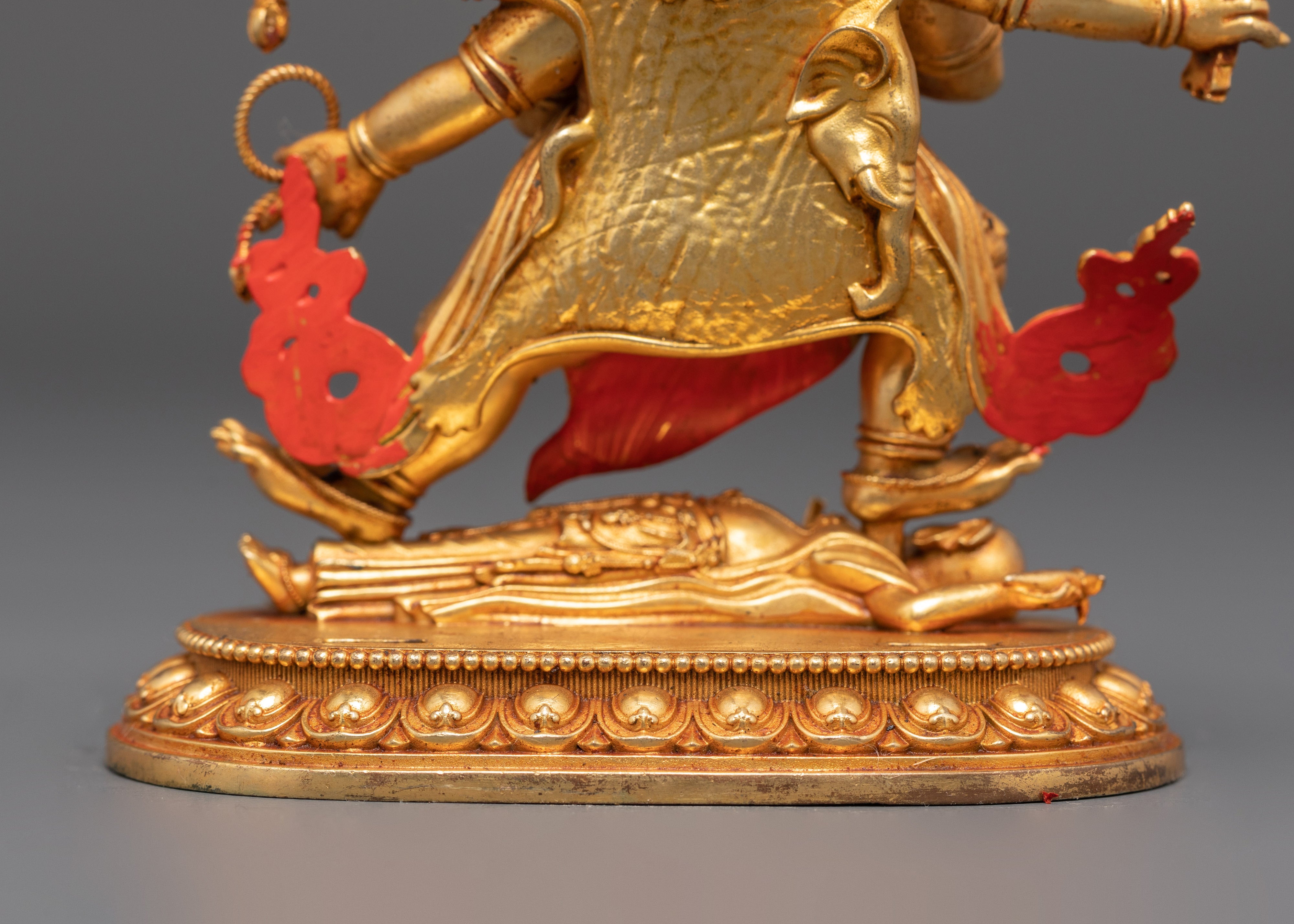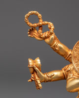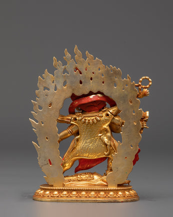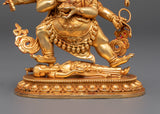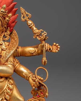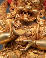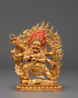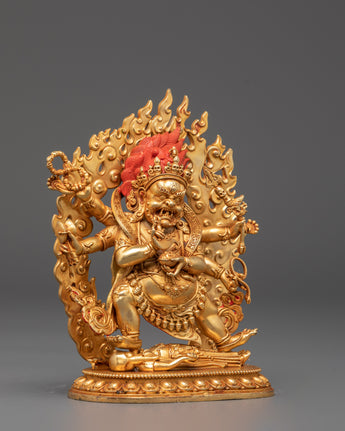 This Six Armed Mahakala statue is painstakingly created to evoke the spirit of protection and strength. The deity's scary expression and numerous arms symbolize his great power to combat evil and defend those who seek him out. The gold-plated finish adds to the statue's visual appeal, while the copper body provides a deep, warm tone to anchor the spiritual energy. This sculpture is ideal for meditation, altar placement, or as part of a Tibetan Buddhist collection, serving as both a reminder of the value of protection and a piece of sacred beauty.