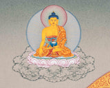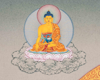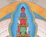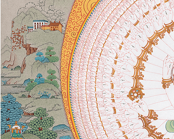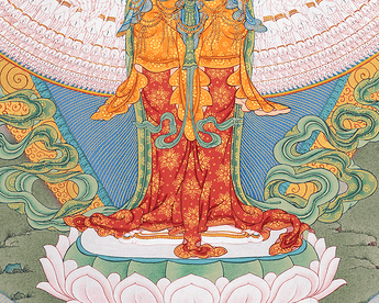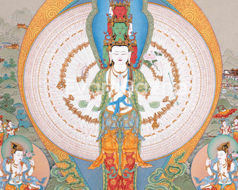 Through a skillful analysis of materials and artistic tradition, the 1000-Armed Chenresig, an honored figure in Tibetan Buddhism that symbolizes compassion, is brought to life. The canvas, which is made from the purest cotton is crafted in the renowned Karma Gadri style, serves as the foundation. It symbolizes simplicity and purity. Following the severe Karma Gadri teachings, the artist uses naturally occurring stone colors that have been carefully ground to paint Chenresig's many arms and compassionate face. Every hue has a spiritual meaning that represents our connection to the divine on earth. A thin layer of 24-karat gold leaf is applied to the sacred image to elevate it, illuminating certain parts of the Thangka with a brilliant brightness. In addition to captivating the viewer, this divine combination of cotton canvas, natural stone colors, and gold transcends the material world and creates a work of visual art that acts as a profound spiritual conduit to the compassionate energy expressed by the 1000-Armed Chenresig.
