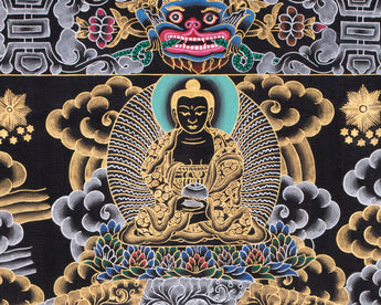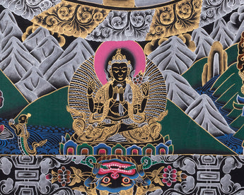 At the center of this magnificent mandala is Chenrezig's renowned 1,000-armed form, with each hand bearing an all-seeing eye that symbolizes his unwavering pledge to see and alleviate the suffering of all sentient beings. This ancient thangka exudes serene strength, featuring elaborate palace geometry, lotus petals, and concentric circles that guide practitioners inward, from the chaos of illusion to the awakened heart of compassion. Celestial beings, fierce protectors, and additional Buddhas seated on lotus thrones encircle the main deity, suggesting enlightenment and cosmic harmony. Displayed on a home altar or in a meditation room, it signifies the immense grace of unbounded compassion.