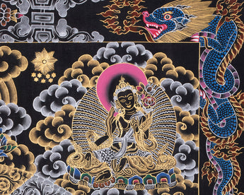 Enter the sacred realm of compassion with this 1000-Armed Chenrezig Mandala, a striking representation of Avalokiteshvara, the Bodhisattva of Infinite Compassion. A talented Nepali artist hand-painted this gorgeous mandala using the traditional thangka technique. A high-quality cotton canvas was selected for the base due to its smooth texture and durability, which facilitate precise, intricate brushwork. The composition gains depth and vitality from the use of vibrant acrylic colors, which also enhances the striking contrast between the celestial figures and the cosmic black background. The thangka's brilliance is enhanced by the application of 24K gold, radiating spiritual glow and highlighting sacred patterns and divine forms. This is an excellent piece of religious art, with each component showcasing outstanding skill and depth reverence.