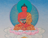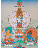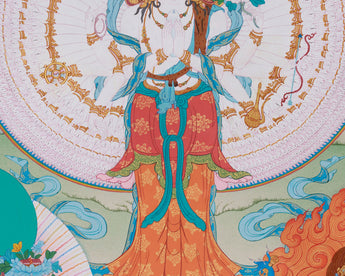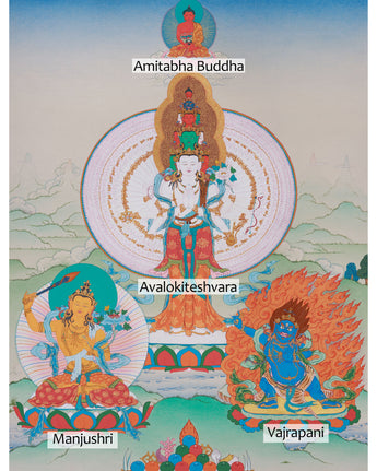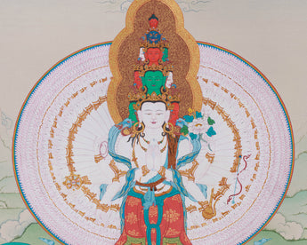 Celebrate the boundless compassion, wisdom, and power of the 1000 Armed Chenrezig, with Manjushri and Vajrapani, beautifully depicted in this hand-painted Thangka. In the classic Karma Gadri style, this beautiful piece of art is created on quality cotton canvas and maintains vivid acrylic colors and real 24K gold embellishments. The image of Chenrezig, surrounded by Manjushri, the Bodhisattva of Wisdom, and Vajrapani, the Protector and symbol of enlightened might, emphasizes his calm yet commanding presence. The assembly is presided over by Amitabha Buddha, who represents the limitless supply of light and wisdom, at the top of the Thangka. Each of Chenrezig's thousand arms has an eye on each palm, demonstrating the meticulousness and commitment of skilled artisans. From the ornaments of the deities to their serene appearances, the golden accents illumine every sacred aspect, transforming this Thangka into a timeless representation of spiritual strength and compassion.