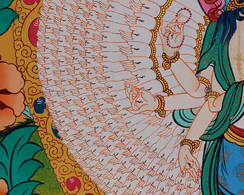 Witness Avalokiteshvara's infinite compassion through this hand-painted Thangka. Created on cotton canvas with brilliant acrylic colors and embellished with pure 24K gold, this thangka artwork represents Avalokiteshvara in his most powerful and compassionate form. Represented with a thousand arms and a thousand eyes, he can perceive the suffering of all beings and offers assistance in countless ways. His mantra, "Om Mani Padme Hum," is believed to invoke his mercy and guidance.
