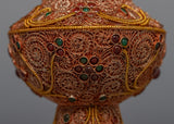 The Karuwa is a one-of-a-kind and exquisitely handcrafted drinking jug with a curved body and a long neck for pouring water or other liquids. This exquisite work of art is gold-plated and embellished with embedded gemstones, adding to its aesthetic value. The Karuwa's long spout allows for easy pouring, making it not only a beautiful decorative item but also a useful tool for everyday use. The Karuwa is a true masterpiece, showcasing the skill and talent of the craftsman who created it with its intricate details and expert craftsmanship.