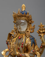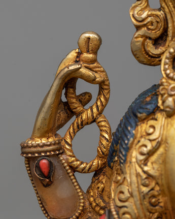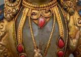 This statue's intricate design features precious coral, lapis lazuli, and turquoise stones that have been carefully inlaid. Coral represents vitality and compassion, lapis lazuli embodies wisdom and truth, and turquoise represents peace and spiritual harmony. Together, they form a harmonious fusion of energies, guiding practitioners on their path to compassion and enlightenment.