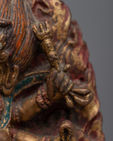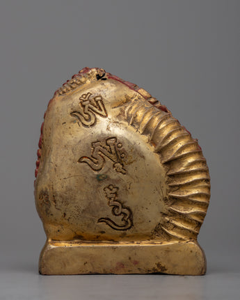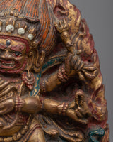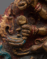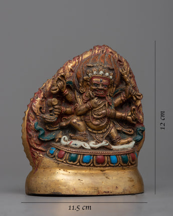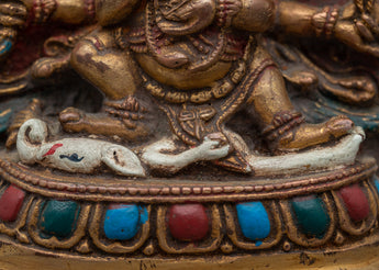 The 6 Armed White Mahakala Statue is a magnificent and meticulously handcrafted piece made from copper. The statue features intricate details and is adorned with 24k gold plating, giving it a luxurious and radiant appearance. Mahakala, a powerful and wrathful deity in Tibetan Buddhism, is depicted in his six-armed form, symbolizing his ability to swiftly overcome obstacles and protect sentient beings. The statue also includes embedded gemstones, adding a touch of brilliance and enhancing its overall aesthetic appeal. With its profound symbolism and impeccable craftsmanship, the 6 Armed White Mahakala Statue is a remarkable addition to any spiritual or artistic collection.