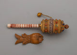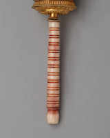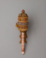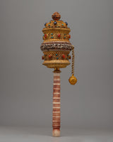 Presenting the magnificent Handheld Prayer Wheel, an exquisitely created spiritual tool with a copper body and elegant gold plating. Real inlays of coral, turquoise, and lapis lazuli decorate this traditional Tibetan prayer wheel; each stone was chosen for its profound spiritual importance and striking beauty. While lapis lazuli is recognized for improving insight and inner truth, coral is said to restore balance, and turquoise is thought to give healing and protection.