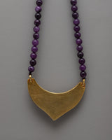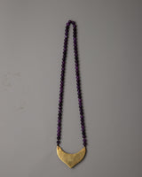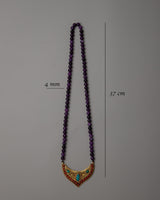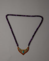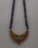 Made with genuine amethyst beads, which are prized for their calming powers of peace and spiritual development, the Amethyst Bead Necklace Long radiates elegance and spiritual significance. The locket's elaborate inlay work with genuine coral and turquoise stones enhances its allure as a centerpiece. It is crafted from copper and electroplated.