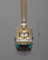 Our beautiful handcrafted Amitabha Buddha pendant is crafted of pure silver and gold plated. It is decorated with precious stones. The Deity is carved directly in the middle of the pendant, giving religious overtones to it.