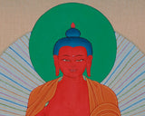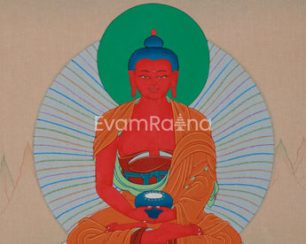 Radiating the essence of boundless compassion, Amitabha Infinite Light Buddha is a symbol of spiritual awakening and enlightened presence in Mahayana Buddhism. It is associated with the Western Pure Land, Sukhavati, a realm of bliss and liberation. This thangka is hand-painted on cotton canvas using vibrant acrylic colors and 24K gold, a traditional practice rooted in the Karma Gadri style. The subtle gold accents elevate the divine aura around the figure, while the precision of acrylic layers brings depth, brilliance, and long-lasting vibrancy to this sacred depiction.