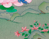 Immerse yourself in meditation with this stunning Amitayus, Buddha of Infinite Light, Thangka. This small thangka, painted in the classic Karma Gadri style, is a unique work of art that uses colors from natural stones to create a vibrant yet timeless palette. It adds a touch of spiritual beauty to your house or altar and is ideal for meditation practice. This thangka is an excellent choice for anyone looking to connect with Tibetan Buddhist traditions because of its excellent artwork and profound spiritual implications. Use this exquisite, original artwork to deepen your spiritual practice.