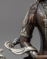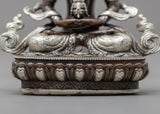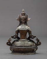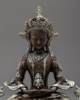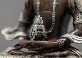 In this statue, we have traditionally sculpted the oxidized copper body of mini Amitayus by machine and used a hand to carve the face, silver plated. You can benefit from this sculpture by utilizing it in different Buddhist auspicious ceremonies and even in your regular yoga activities. We have exquisitely adorned the crown with silver plates and embellished the ornaments with precious materials which are of high quality. This art will be a tremendous meditation gift from Nepal to a practitioner like you.