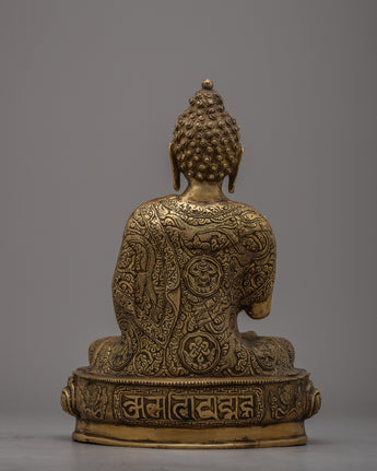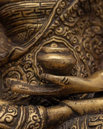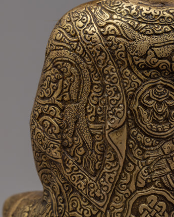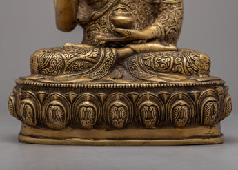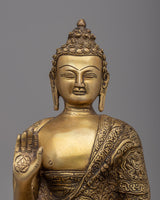Introducing the stunning Amoghasiddhi Buddha Statue, which was expertly handcrafted on a brass body. This alluring statue shows Amoghasiddhi, the personification of bravery and success, sitting gracefully on a lotus base. The intricate designs adorning the monastic robe, symbolizing the profound spiritual teachings and wisdom of the Buddha, show incredible attention to detail. The calm expression on the face invites you to connect with the profound qualities of Amoghasiddhi by radiating calm and inner peace.