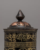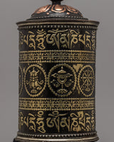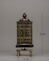 The auspicious prayer wheel, which is made with regard and tradition, is a representation of attention and spiritual dedication. This prayer wheel, which is crafted by handmade of copper and brass, exemplifies the deft artistic design and meticulous attention to detail typical of Tibetan religious objects. At 29 centimeters high, it radiates holiness and urges practitioners to spin the wheel, an age-old ritual that sends blessings and prayers into the cosmos.