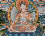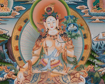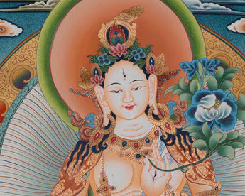 The Authentic White Tara Thangka is a stunning Tibetan Buddhist art piece, hand-painted to capture the divine essence of the revered goddess White Tara. The thangka features intricate details and vibrant colors, showcasing White Tara, the Five Buddhas, Amitayus, and Namgyalma.
