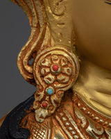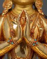 The Avalokiteshvara statue Chenrezig in Tibetan Buddhism is a stunning representation of infinite compassion and enlightenment. It is meticulously created from a copper body and embellished with Artificial Stone coral and turquoise stones to convey the aura of divine serenity. Standing 33.5 cm tall, 27 cm broad, and weighing 4.17 kg, this statue radiates spiritual grace, making it an ideal addition to any meditation space or sacred shrine.