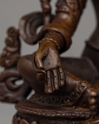 This beautiful green Tara statue evokes peace and divine grace. It was made by hand from oxidized copper and features a beautiful face painted in gold. In Tibetan Buddhism, the goddess of compassion and quick thinking, Green Tara, symbolizes protection and direction. With dimensions of 15 cm in height and 11 cm in width, this fantastic item is perfect for altars, meditation areas, or serving as the main attraction of your spiritual décor.