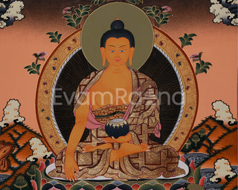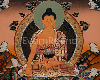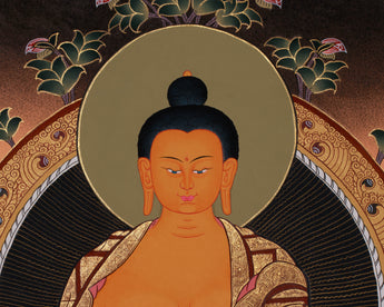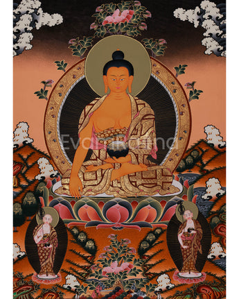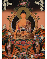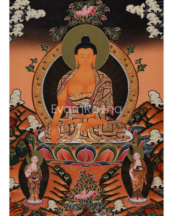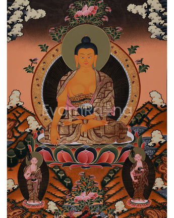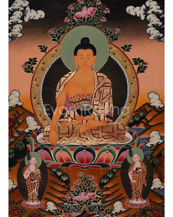 This hand-painted thangka of Shakyamuni Buddha, also known as Siddhartha Gautam, accompanied by his chief disciples, Sariputta and Maudgalyayana, is a significant spiritual and artistic work. Shakyamuni Buddha is depicted in serene meditation, seated on a lotus throne, symbolizing his enlightenment under the Bodhi tree, and with his right hand touching the earth in the Bhumisparsha Mudra, symbolizing his enlightenment. His left-hand rests in his lap, holding an alms bowl, representing his role as a wandering monk. His calm and compassionate expression reflects tranquility and wisdom. Sariputta and Maudgalyayana, his foremost disciples, are flanked by the central figure, highlighting the Buddha's teachings and the strength of his spiritual community. The background is intricately detailed with rich colors and symbolic motifs, highlighting the sacred nature of the scene.