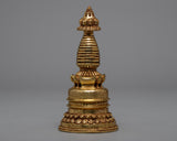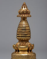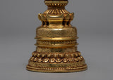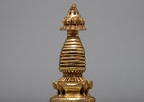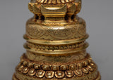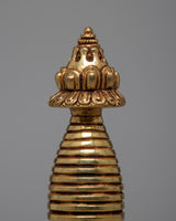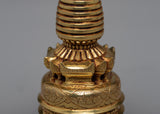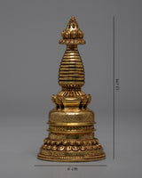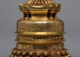 The stupa is a handmade Buddhist shrine finely detailed, which is entirely gold-plated. The stupa has beautiful lotus designs on the bottom which symbolize purity of the body, speech, and mind. The top has perfectly designed thirteen umbrella wheels and other carvings similarly.