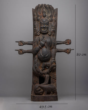 Presenting the Bhairav Wood Strut, an exquisite blend of craftsmanship and heritage carefully carved from hardwood material. Standing at a height of 80cm and a width of 49.5cm, this remarkable sculpture has the well-known Bhairav, a deity, beautifully engraved onto the wood, commanding it in any setting.